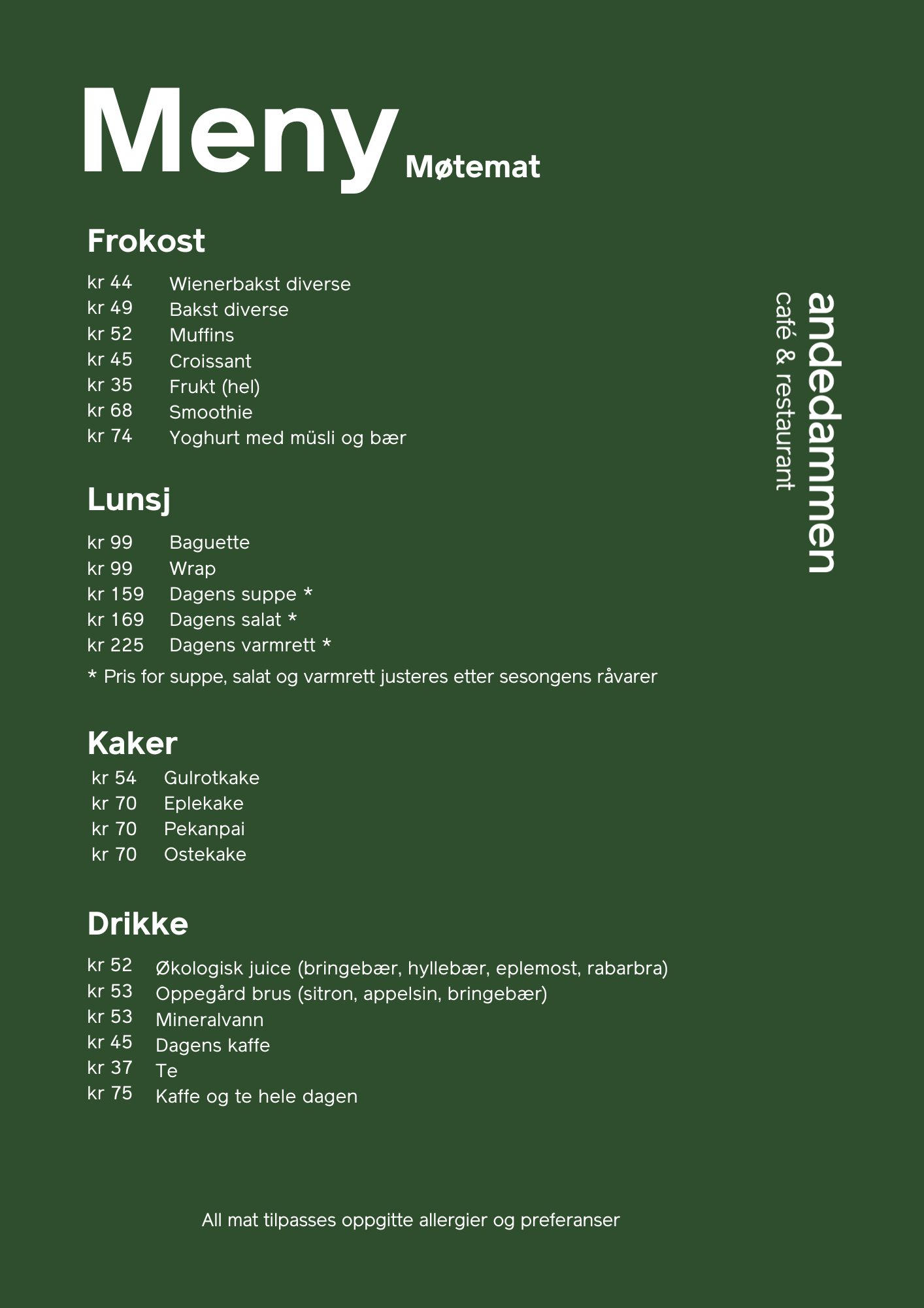 Andedammen er også et sted for viktige øyeblikk. Vi tilbyr skreddersydde arrangementer – fra bryllup, dåp, konfirmasjon og minnestunder, til seminarer, konferanser og verksteder. Våre lokaler egner seg like godt til lunsjmøter og foredrag som til feiringer og seremonier.
